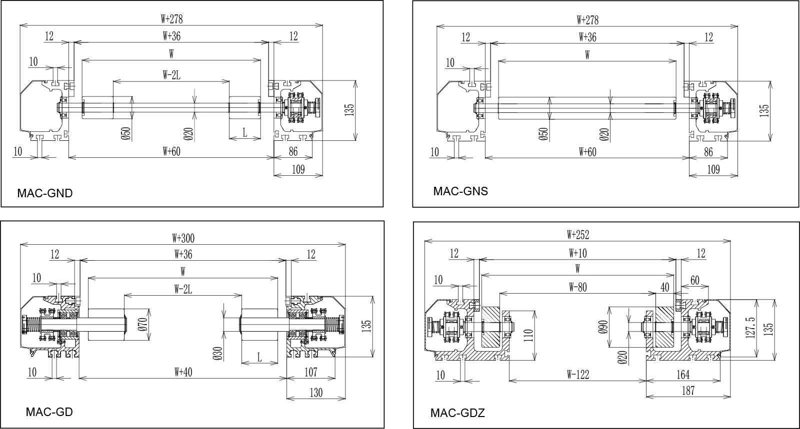 | Typ | MAC-GND (kontinuerlig axel typ) | MAC-GNS (trumtyp) | MAC-GD (Cantilevered Structure) | MAC-GDZ (Heavy Duty Type) |